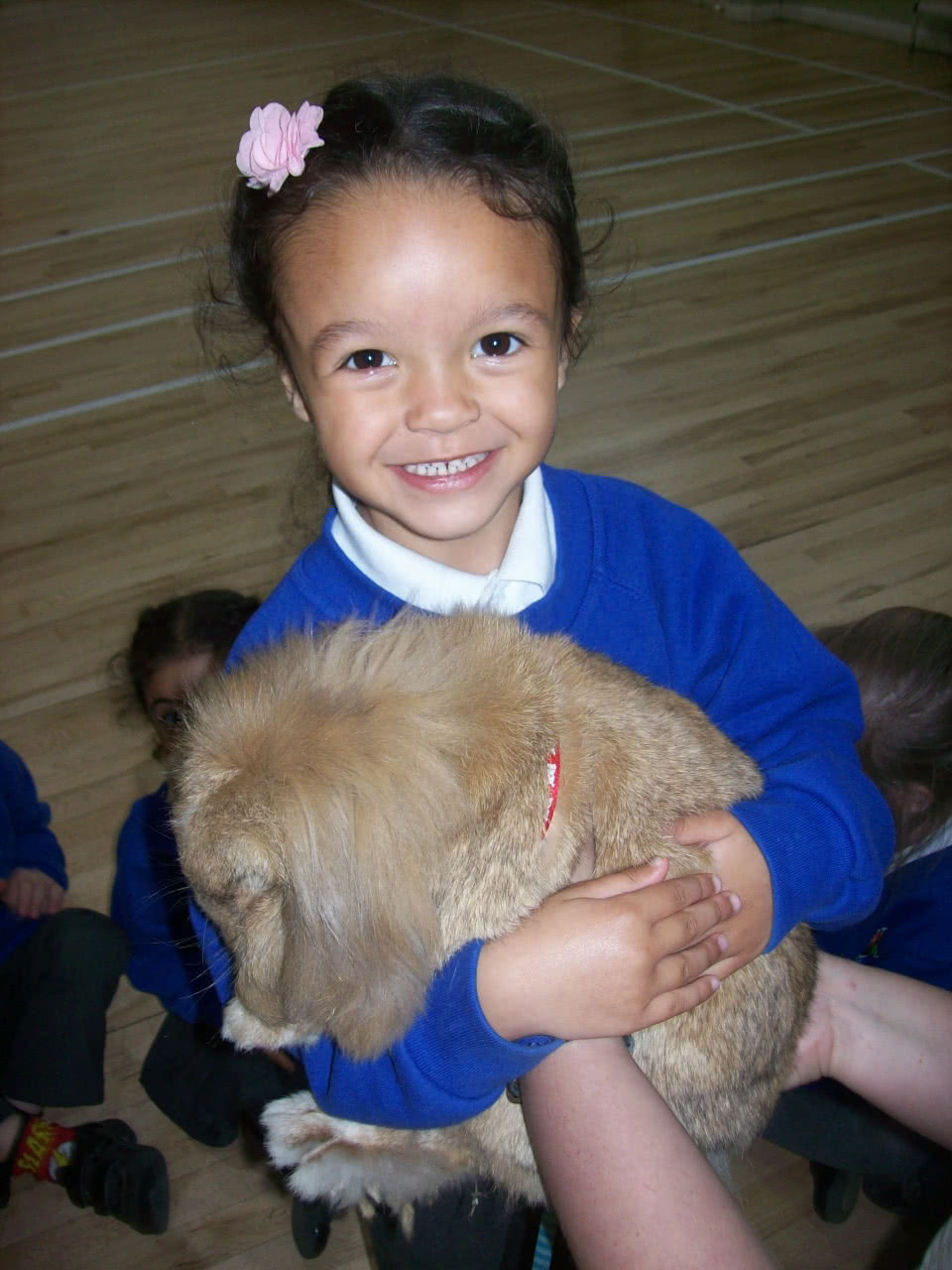 Some children held a giant snail and some children walked a rabbit on a lead.